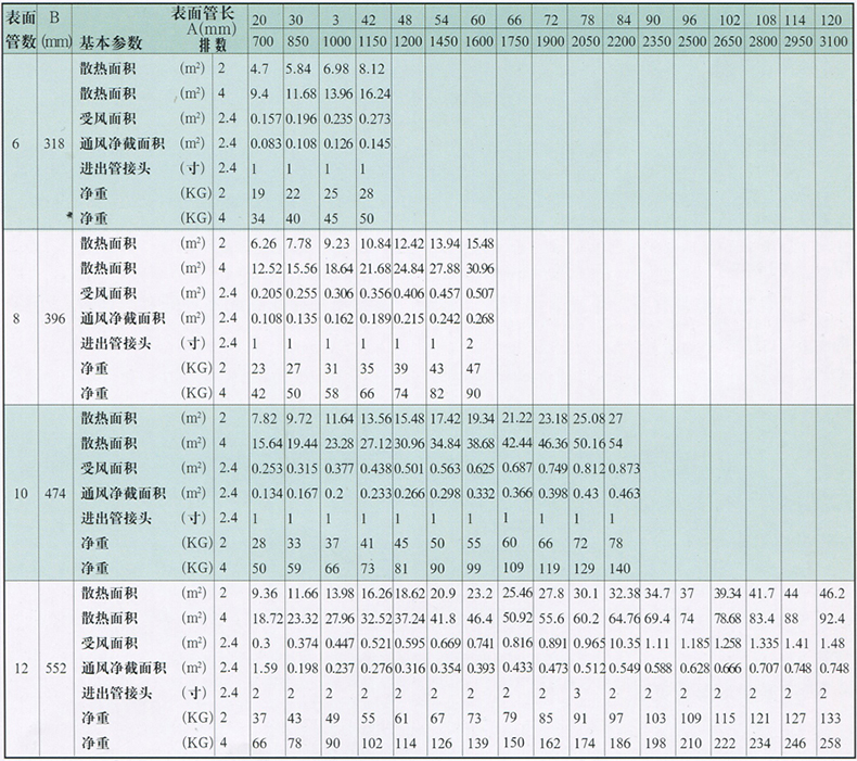 型號(hào)-排數(shù)-表面管數(shù)-表面管長(英寸)。